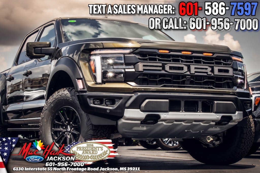 Shelter Green 2024 Ford F-150 Raptor 4WD 10-Speed Automatic 3.5L V6 EcoBoost F-150 Raptor, 4D SuperCrew, 3.5L V6 EcoBoost, 4WD, Shelter Green, 14 Speakers, 17" Cast Aluminum Wheels, 4-Wheel Disc Brakes, Adaptive suspension, Auto High-beam Headlights, Brake assist, Electronic Locking w/4.10 Axle Ratio, Equipment Group 801A Standard, Fully automatic headlights, Heads-Up Display, Heated front seats, Heated rear seats, Lane Departure Warning System, Leather Trim Seats, Navigation system: Connected Navigation, Radio: B&O Unleashed Sound System by Bang & Olufsen, Speed-sensing steering, Steering wheel mounted audio controls, SYNC 4 w/Enhanced Voice Recognition, Traction control, Twin Panel Moonroof, Ventilated front seats.