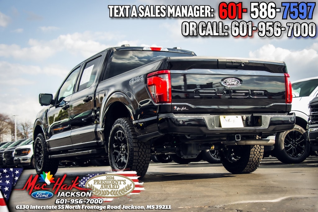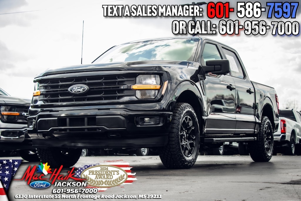Agate Black Metallic 2024 Ford F-150 XLT 4WD 10-Speed Automatic 2.7L V6 EcoBoost F-150 XLT, 4D SuperCrew, 2.7L V6 EcoBoost, 10-Speed Automatic, 4WD, Agate Black Metallic, Black Cloth, 3.55 Axle Ratio, 6" Black Running Boards, Auto High-beam Headlights, Automatic temperature control, Black Exterior Badging, Black Grille, Body-Color Front & Rear Bumpers, Dark Interior Appliques, Electronic Stability Control, Equipment Group 301A Standard, Floor Shifter, Fully automatic headlights, Gray Box Side Decal, GVWR: 6,650 lbs Payload Package, Navigation system: Connected Navigation, Radio: AM/FM SiriusXM w/360L, SYNC 4 w/Enhanced Voice Recognition, Unique Sport Cloth 40/Console/40 Front-Seats, Wheels: 18" Gloss Black, XLT Black Appearance Package.