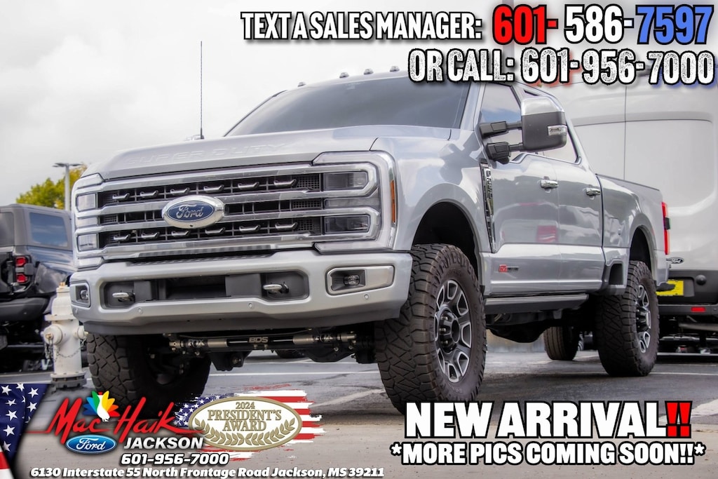 Silver 2024 Ford F-250SD Platinum 4WD 10-Speed Automatic 6.7L High Output Power Stroke V8 Diesel F-250SD Platinum, 4D Crew Cab, 6.7L High Output Power Stroke V8 Diesel, 10-Speed Automatic, 4WD, Silver, ABS brakes, Alloy wheels, Compass, Electronic Stability Control, Electronic-Locking w/3.55 Axle Ratio, F-250 >10K GVWR Package, Front dual zone A/C, FX4 Off-Road Package, Heated door mirrors, Heated front seats, Heated rear seats, Hill Descent Control, Illuminated entry, LED Roof Clearance Lights, Low tire pressure warning, Memory seat, Navigation system: Connected Navigation (includes complimentary 1-year trial), Off-Road Specifically Tuned Shock Absorbers, Order Code 703A, Remote keyless entry, Traction control, Twin Panel Power Moonroof, Unique FX4 Off-Road Box Decal.