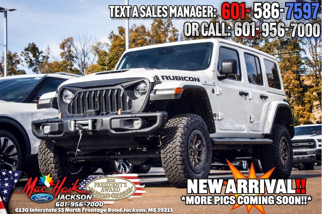 Bright White Clearcoat 2021 Jeep Wrangler Unlimited Rubicon 392 4WD 8-Speed Automatic SRT HEMI 6.4L V8 MDS New Tires!, Wrangler Unlimited Rubicon 392, 4D Sport Utility, SRT HEMI 6.4L V8 MDS, 4WD, Black Leather, 3.73 Rear Axle Ratio, 4-Wheel Disc Brakes, 7 & 4 Pin Wiring Harness, ABS brakes, AM/FM radio: SiriusXM, Automatic temperature control, Body Color 3-Piece Hard Top, Class II Receiver Hitch, Electronic Stability Control, Freedom Panel Storage Bag, Leather Trimmed Bucket Seats, Navigation System, No Soft Top, Quick Order Package 27X, Radio: Uconnect 4C Nav w/8.4" Display, Rear Window Defroster, Rear Window Wiper/Washer, Steering wheel mounted audio controls, Telescoping steering wheel, Tilt steering wheel, Traction control, Trailer Tow Package, Wheels: 17" x 7.5" Beadlock Capable.