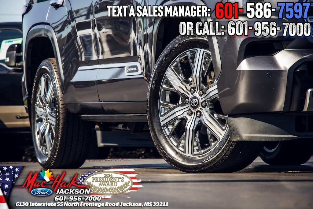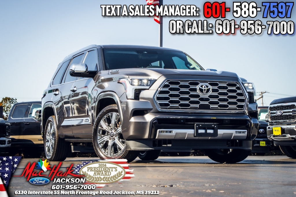 Gray 2025 Toyota Sequoia Capstone 4WD 10-Speed Automatic V6 Hybrid Sequoia Capstone, 4D Sport Utility, V6 Hybrid, 10-Speed Automatic, 4WD, Gray, ABS brakes, Active Cruise Control, Alloy wheels, Apple CarPlay/Android Auto, Compass, Electronic Stability Control, Front dual zone A/C, Heads-Up Display, Heated & Ventilated Front Seats, Heated door mirrors, Heated front seats, Heated rear seats, Illuminated entry, Low tire pressure warning, Memory seat, Navigation System, Navigation system: Drive Connect (1 year trial) includes Cloud Navigation with real time traffic and Google POI, Power Liftgate, Power moonroof, Remote keyless entry, Semi-Aniline Leather Seat Trim, Traction control, Ventilated front seats, Ventilated rear seats.